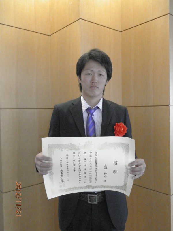 一級技能検定(左官)における優秀な成績者であったと受賞