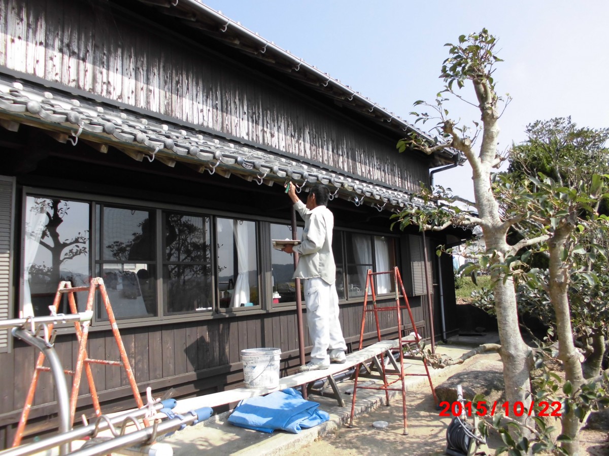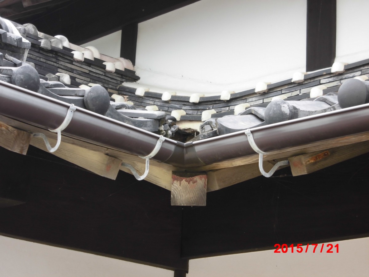 一階瓦屋根の廻りの漆喰が所どころ傷んでいます。